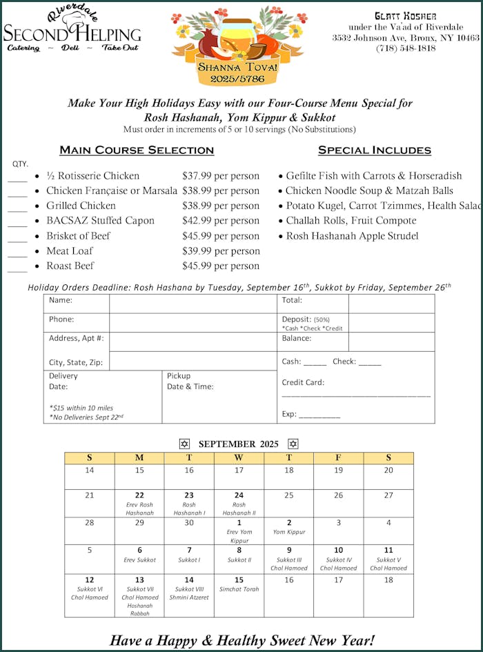 Traditional Jewish cuisines, meat, poultry, fish, deli sandwiches, sides and salads, soups, appetizers, and more!